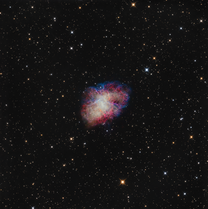 La nebulosa, oggi vasta più di sei anni luce, è formata dai gas in espansione espulsi durante l'esplosione della Supernova 1054; i gas si stanno espandendo alla velocità di 1500 km/s e possiedono una massa totale di circa 4,6±1,8 M⊙. La supernova che la produsse fu osservata per la prima volta il 4 luglio 1054 e venne registrata dagli astronomi cinesi e arabi dell'epoca; la sua luminosità era tale che la magnitudine apparente dell'evento fu compresa tra −7 e −4,5,[5] tale da renderla visibile ad occhio nudo durante il giorno, sorpassando la luminosità apparente di Venere. La Nebulosa Granchio si trova a circa 6500 al dal sistema solare; perciò l'evento che l'ha prodotta è in realtà avvenuto 6 500 anni prima del 1054, cioè circa nel 5400 a.C.